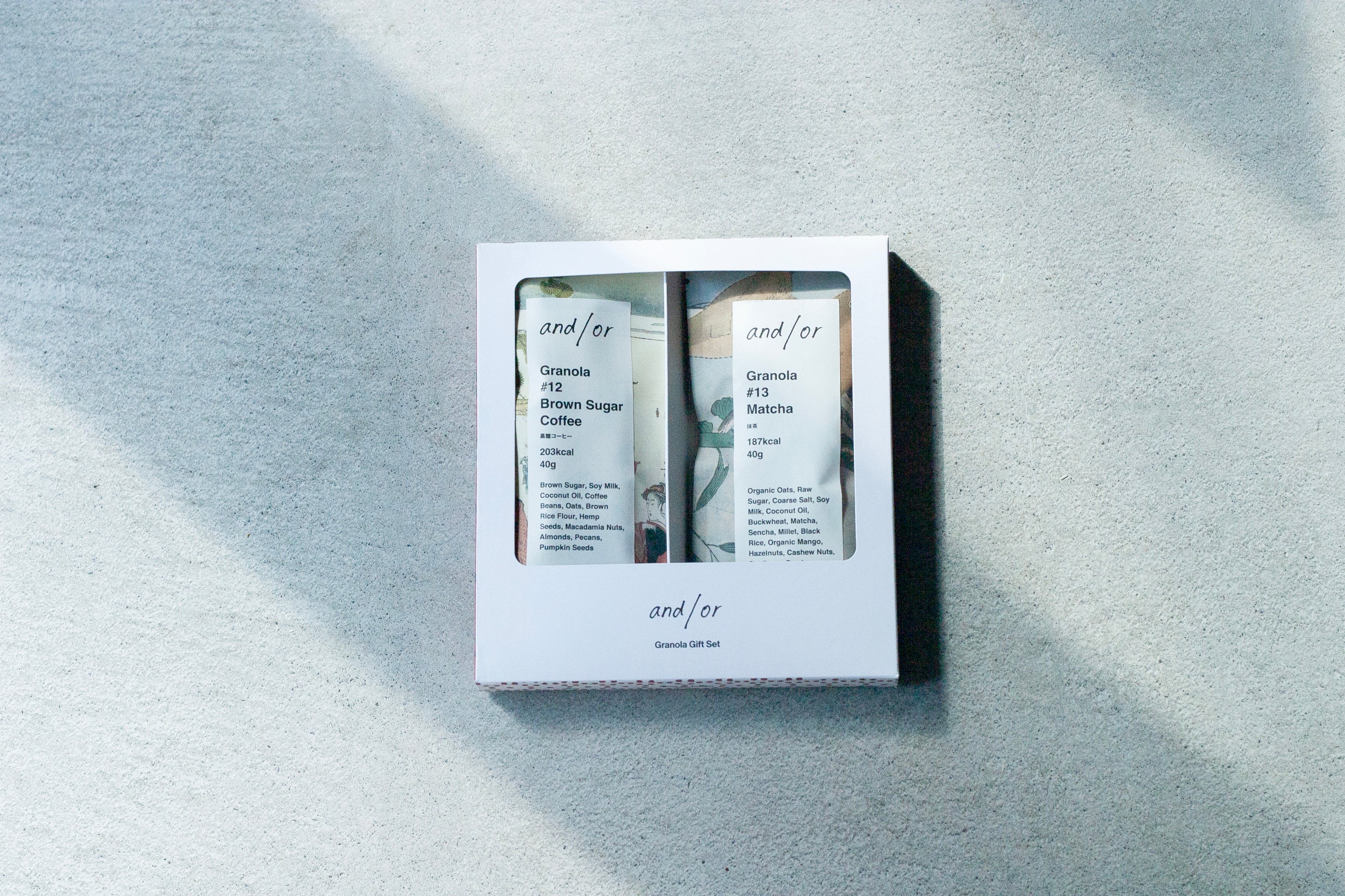 Perfect gift set featuring Brown Sugar Coffee and Matcha Dates granola in elegant Japanese-patterned packaging inspired by ukiyo-e art. Ideal as a Japan souvenir or a thoughtful gift.